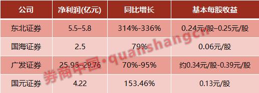 就目前披露业绩预告/业绩快报的4家券商来看,一季度净利润同比增幅七成“起步”,高者甚至超过300%:国海证券净利润2.50亿元,同比增长79%;广发证券净利润25.95亿元–29.76亿元,同比增长70%-95%。国元证券实现净利润4.22亿元,同比增幅达到153.46%,而东北证券盈利超过5.5亿元,同比增幅达到314%-336%。
